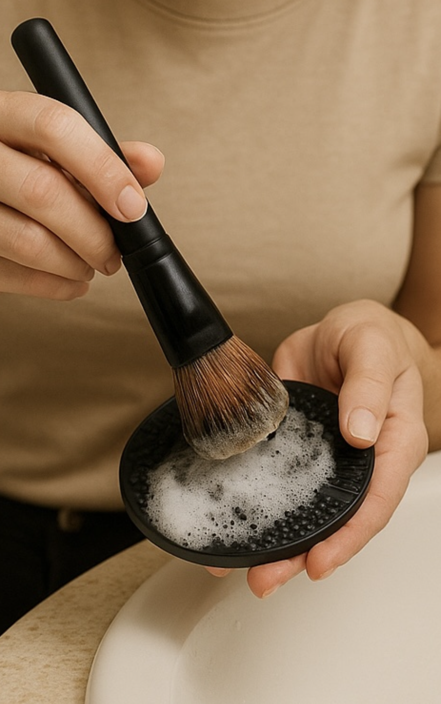 Swirl for 30 seconds to dissolve buildup and condition bristles. - Rinse clear, reshape, and lay flat to dry.