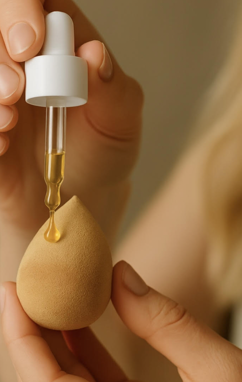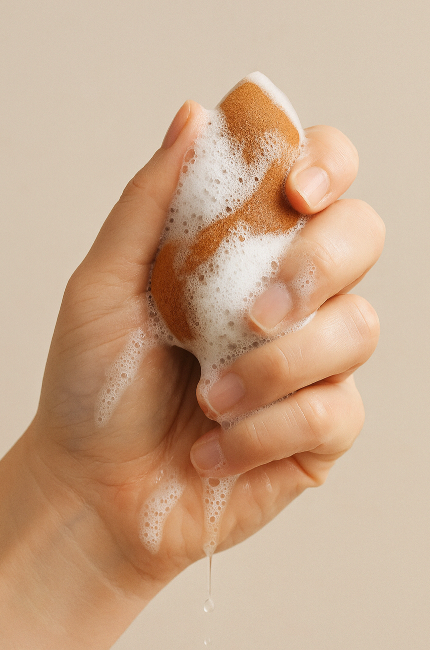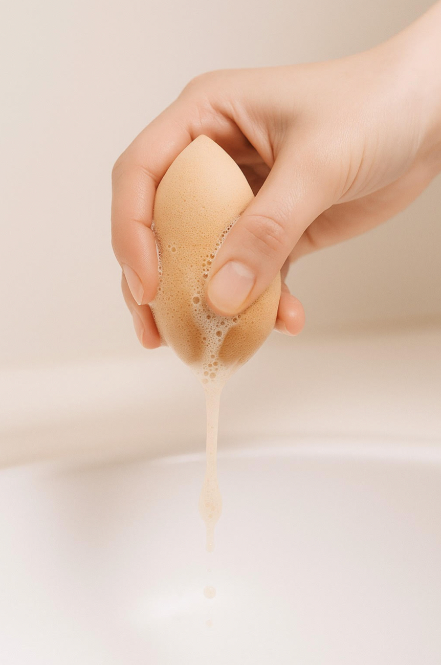 - Apply a few drops of cleanser directly onto the sponge or puff.